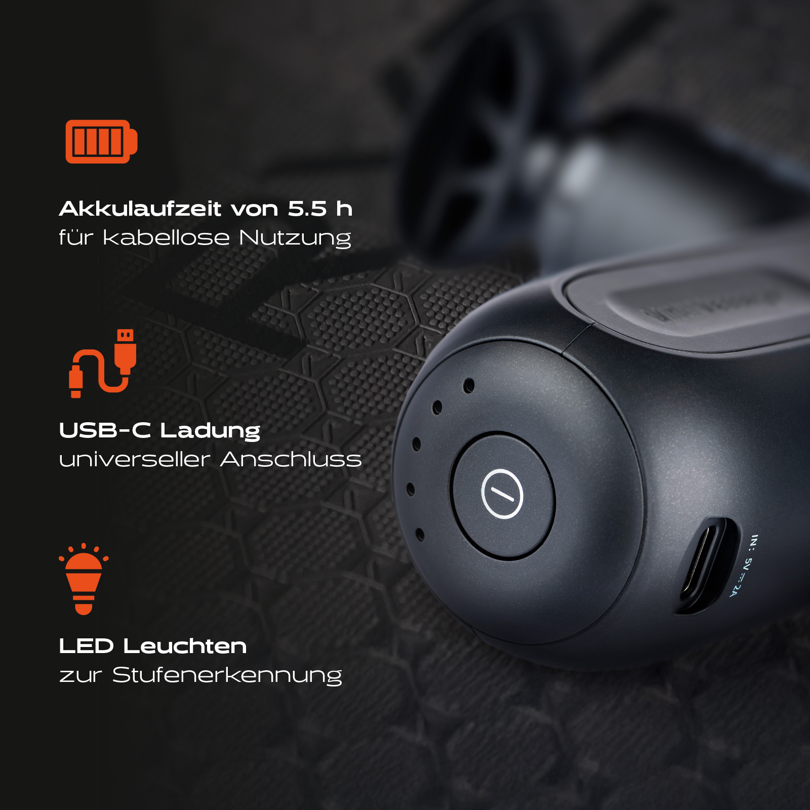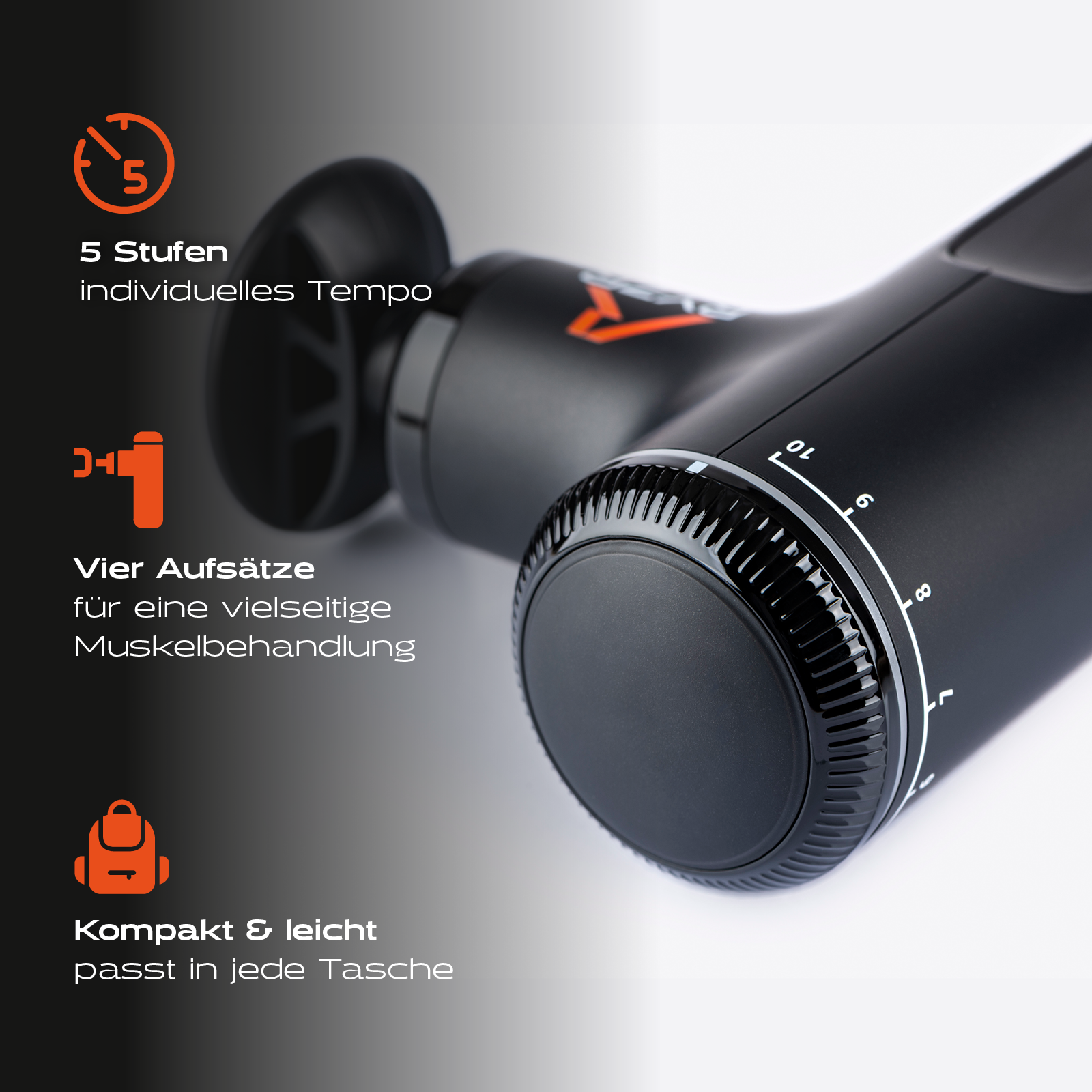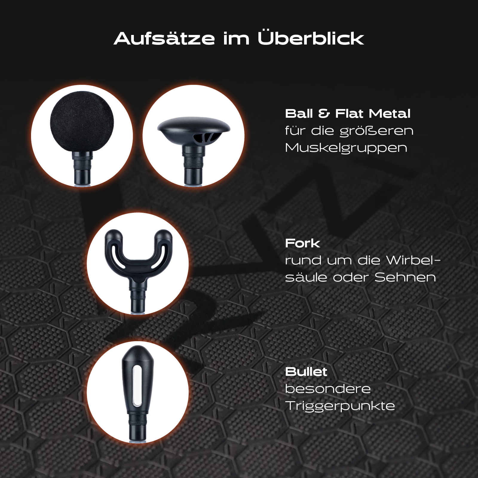 - Vier Massageaufsätze – für vielseitige Triggerpunkt- und Muskelbehandlung.