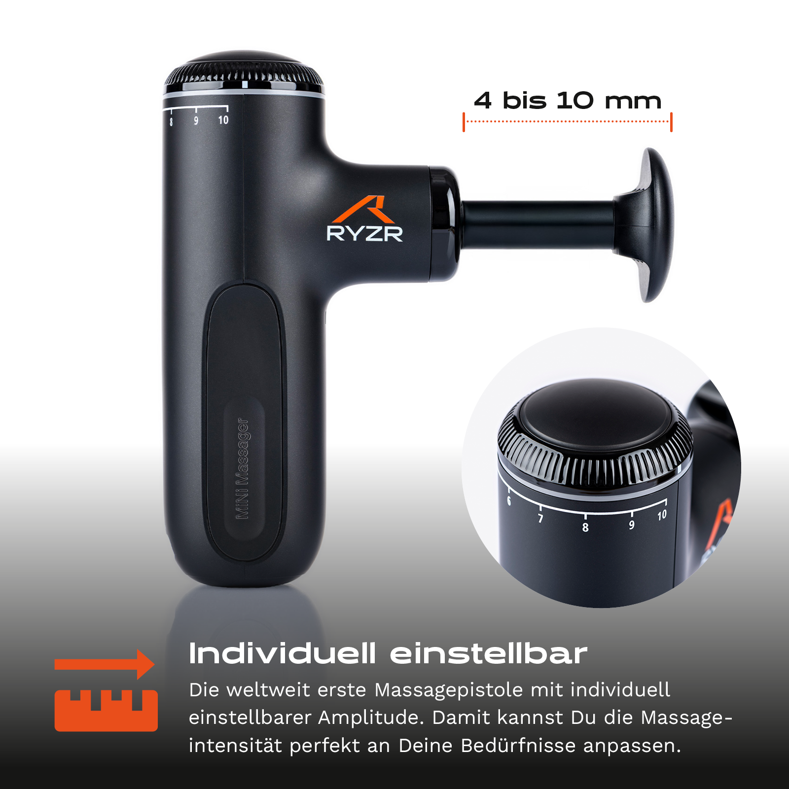 Das Besondere: Die RYZR Variogun ist die erste Massagepistole mit individuell einstellbarer Amplitude von 4 - 10 mm. Damit kannst Du die Massageintensität perfekt an Deine Bedürfnisse anpassen – von sanfter Entspannung bis hin zur intensiven Triggerpunkt- und Muskelbehandlung.